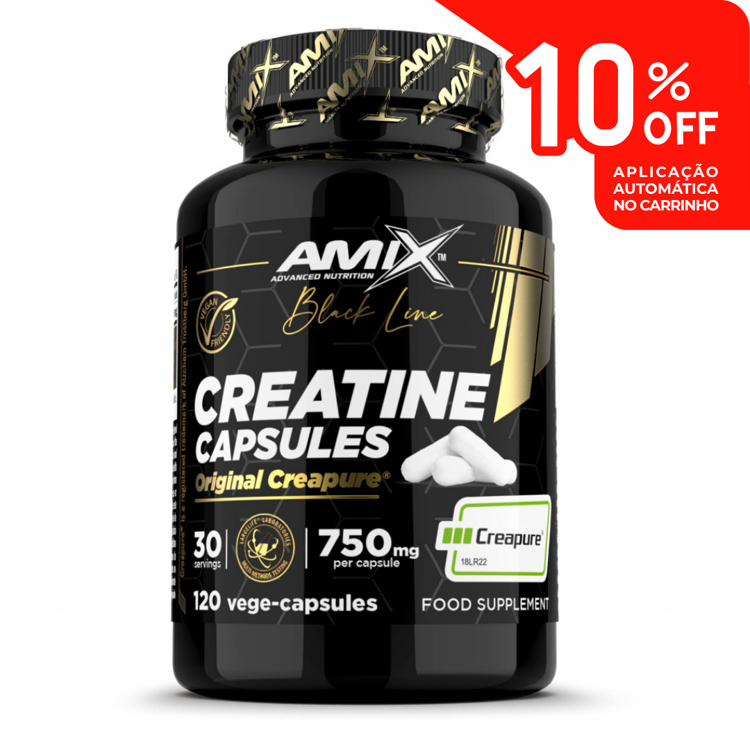 Cápsulas com creatina monoidratada Creapure. A creatina aumenta o desempenho físico em séries sucessivas de exercícios de curta duração e alta intensidade. O efeito benéfico é obtido a partir de uma ingestão diária mínima de 3 g de creatina.