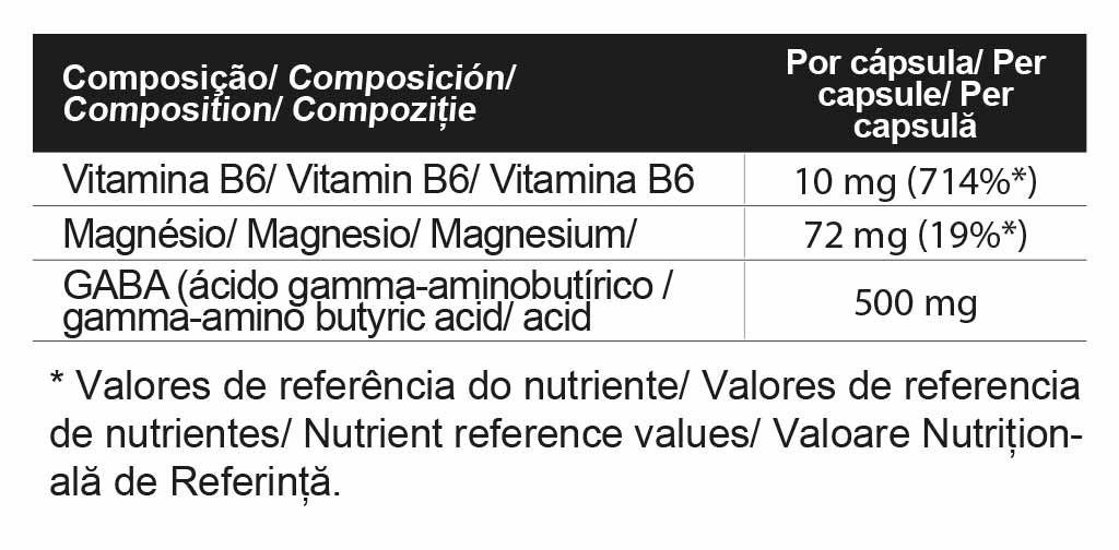 Esta fórmula contribui para a promoção de um estado de relaxamento, ajuda a reduzir a tensão nervosa, melhora o humor e apoia um sono mais reparador. O GABA actua inibindo excessos de estímulos neurais, o magnésio e a vitamina B6 ajudam a manter as funções psicológicas e a reduzir o cansaço e a fadiga.