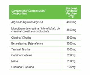 Fórmula completa com aminoácidos, creatina e estimulantes naturais.