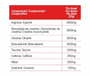 A L-arginina e a L-citrulina contribuem para o aumento do fluxo sanguíneo e para uma melhor entrega de nutrientes ao músculo, promovendo a vasodilatação e ajudando a melhorar a sensação de “pump”. A beta-alanina ajuda a reduzir a acidez muscular, atrasando a fadiga, enquanto a creatina apoia a força e a potência em séries curtas e intensas. A cafeína, em combinação com Maca e Guaraná, fornece energia, foco e maior resistência ao esforço.