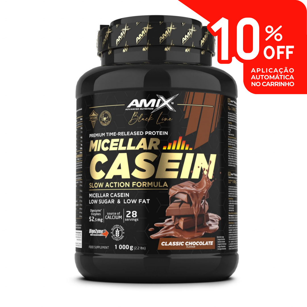 A caseína micelar é um tipo de proteína de digestão lenta com um espectro completo de aminoácidos essenciais. É ideal para consumo durante períodos mais longos entre as refeições – por exemplo, à noite, antes de dormir.
